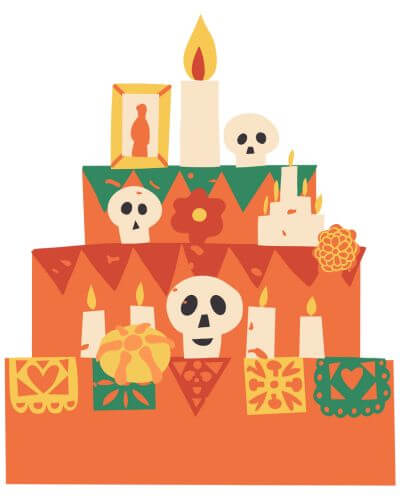 Na oltář Día de los Muertos se kladou fotky zesnulých, pan de muerto, svíčky, květiny cempasúchil, cukrové lebky, jídlo, které měli zesnulí rádi, a někdy i tequila. Každý předmět má svůj význam, aby duše našly cestu domů.